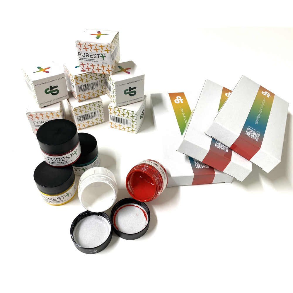 Dokonale stabilní barva nejvyšší kvality vyvinutá oddělením výzkumu a vývoje společnosti CTS conservation. Retušovací barvy PUREST+ představují důležitý krok ve výzkumu stability pigmentů a pojivové pryskyřice, rozpuštěných ve směsi rozpouštědel s nízkou toxicitou. Technologie těchto barev vychází ze zkušeností s vývojem retušovacích barev Gamblin, a podobně jako ony, jsou stejně jako například nové Kremer Retušovací barvy v Laropal® A 81, založeny na technologii tohoto aldehyd pryskyřičného pojiva.